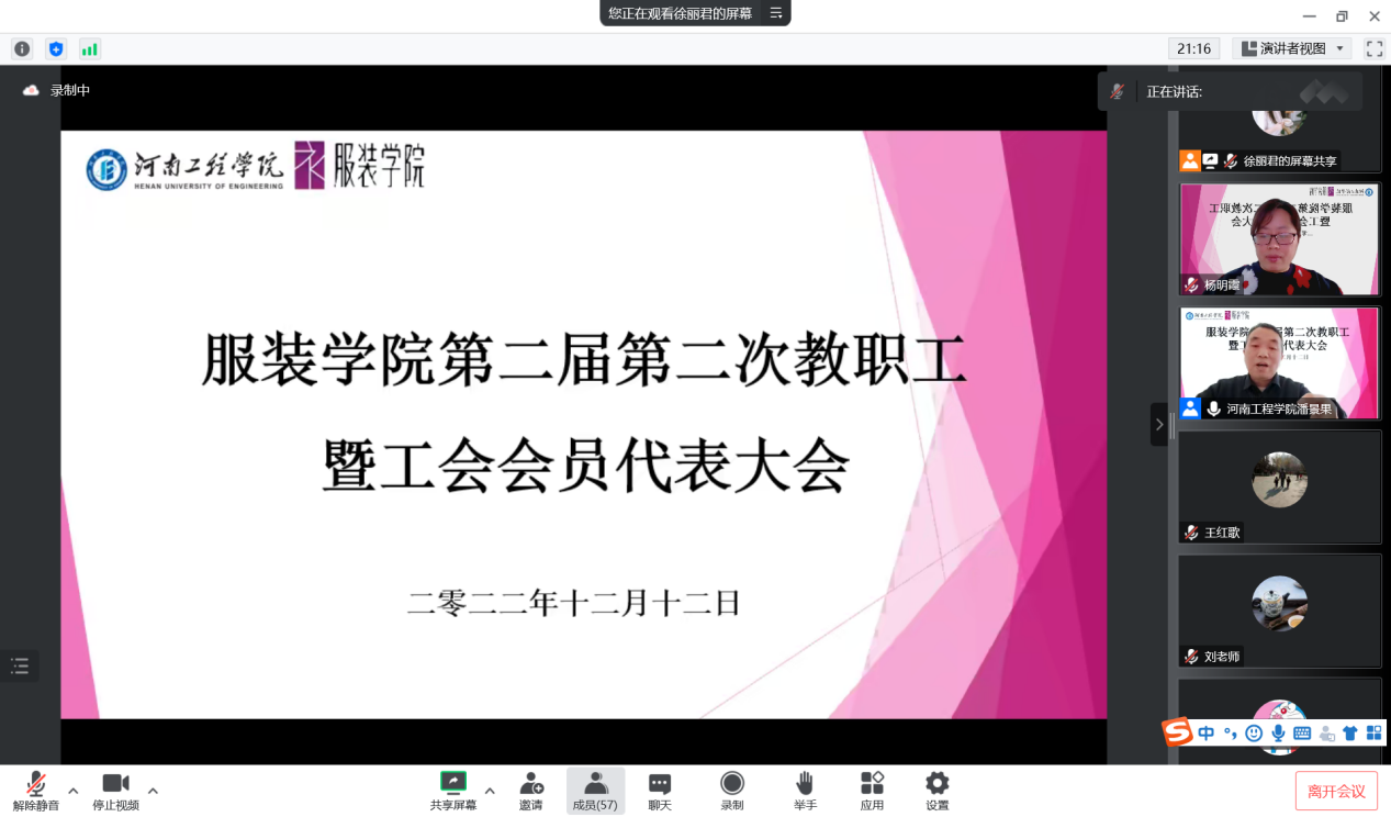 12月12日,服装学院通过线上形式召开第二届第二次教职工暨工会会员代表大会,服装学院全体教职工参会,会议由服装学院党委书记潘景果主持。